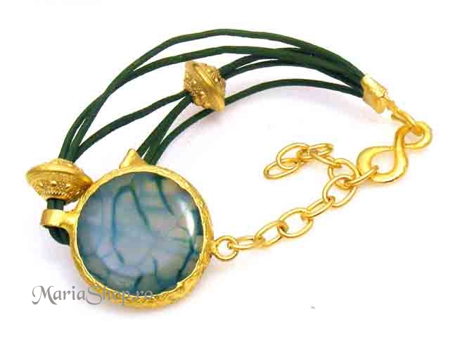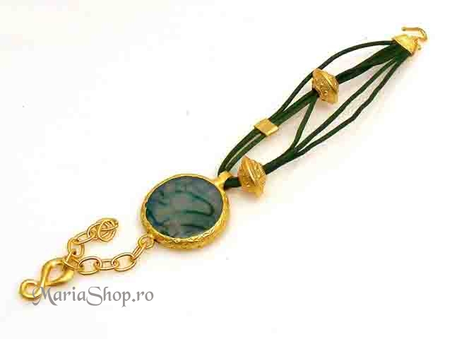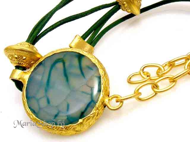 Bratara cu fire agata, o piesa superba, in montura aurita, snur din piele verde asortat si accesorii aurite.Bratara cu fire agata, o piesa superba, in montura aurita, snur din piele verde asortat si accesorii aurite.