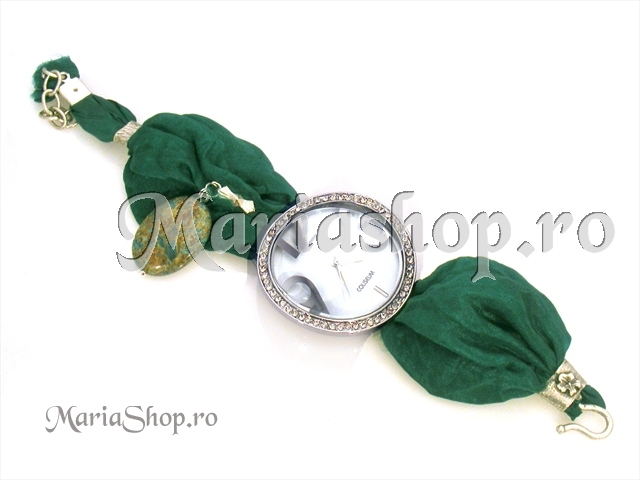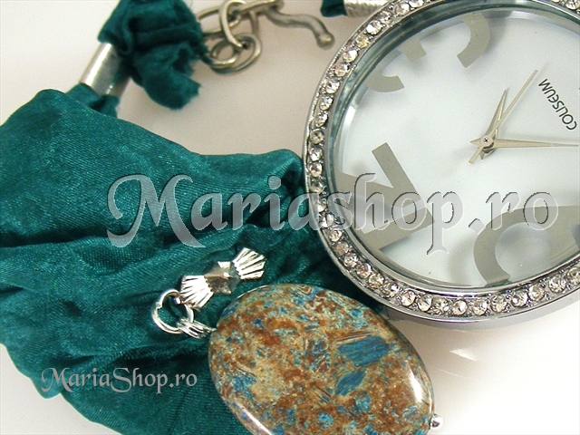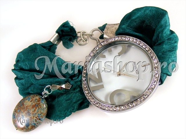 Ceas cu bratara din matase naturala, cu intaritura, inchidere din elemente de zamak argintat. Ceasul e insotit de o margica ovala, de 20 de milimetri, din turcoaz african